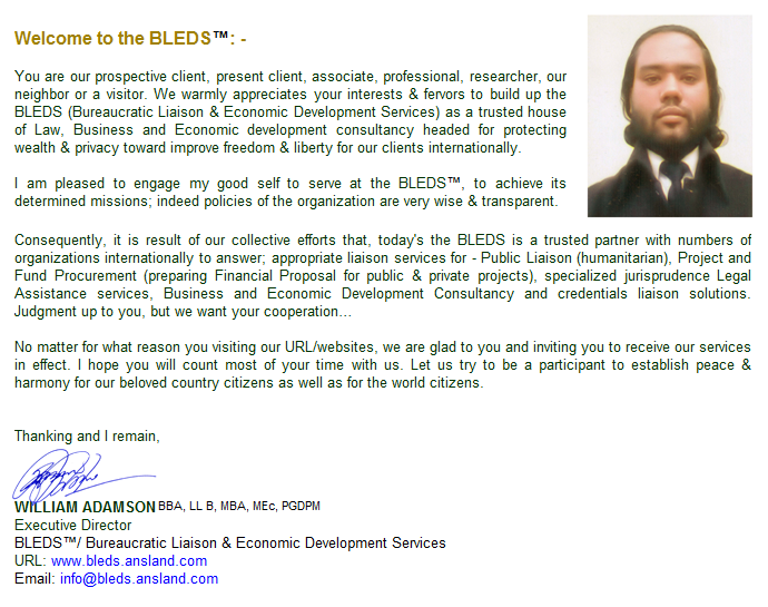 All contractual documents, notices & publications of the 'BLEDS™ <Bureaucratic Liaison & Economic Development Services> are subject to legalize from the followings: -